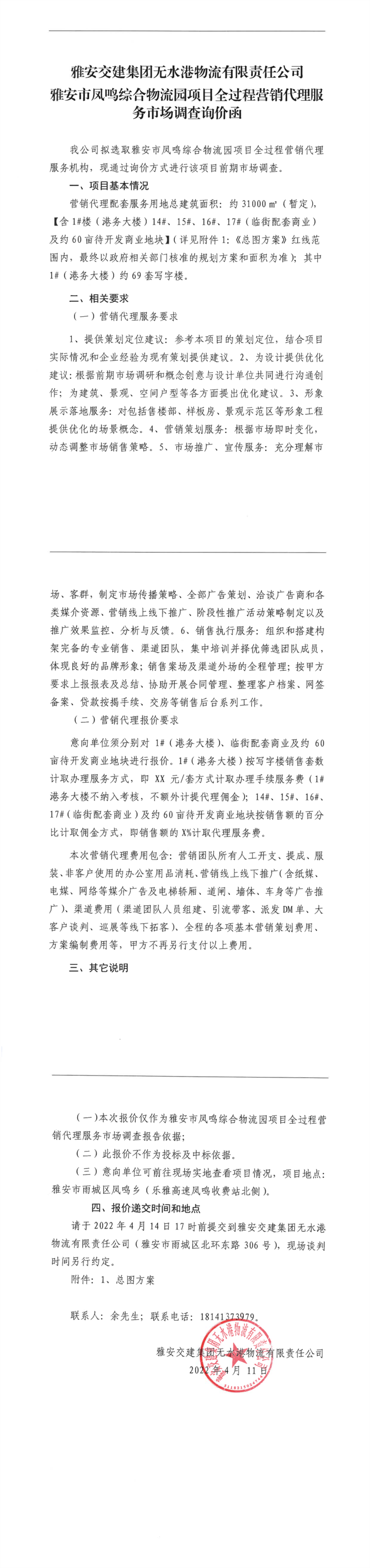 雅安交建集團(tuán)無水港物流有限責(zé)任公司雅安市鳳鳴綜合物流園項(xiàng)目全過程營銷代理服務(wù)市場(chǎng)調(diào)查詢價(jià)函