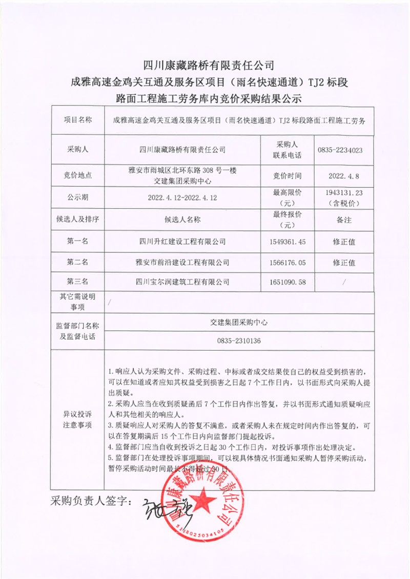 四川康藏路橋有限責任公司成雅高速金雞關互通及服務區(qū)項目(雨名快速通道)TJ2標段路面工程施工勞務庫內競價采購結果公示