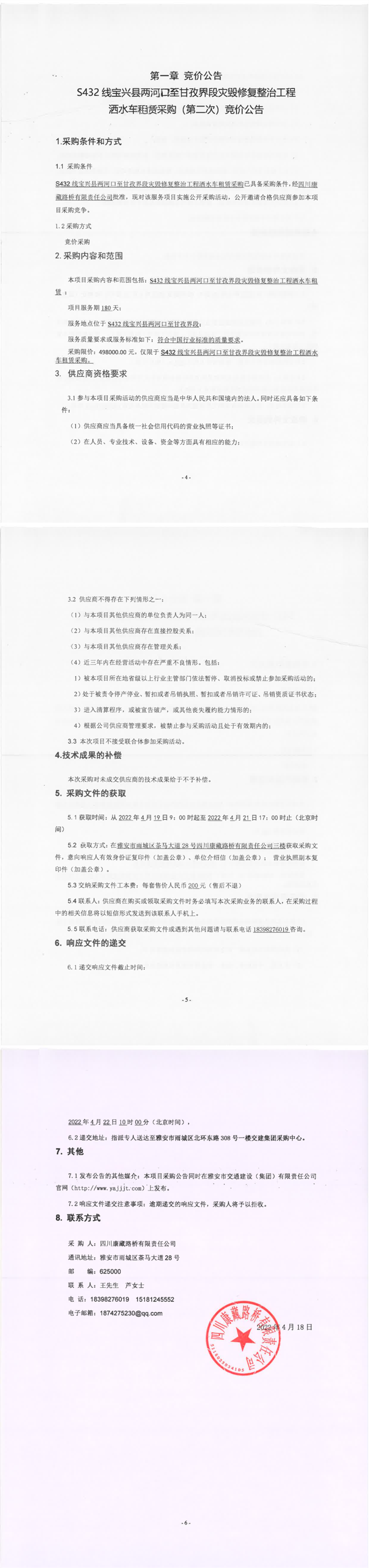 四川康藏路橋有限責(zé)任公司S432線寶興縣兩河口至甘孜界段災(zāi)毀修復(fù)整治工程灑水車租賃采購(第二次)競價(jià)公告