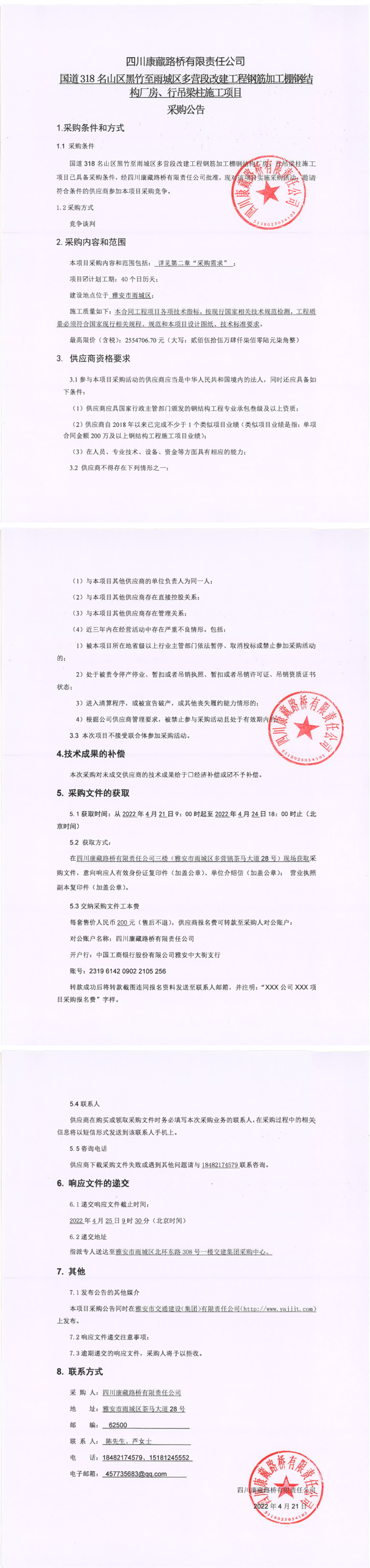 四川康藏路橋有限責任公司國道318名山區(qū)黑竹至雨城區(qū)多營段改建工程鋼筋加工棚鋼結(jié)構(gòu)廠房、行吊梁柱施工項目采購公告