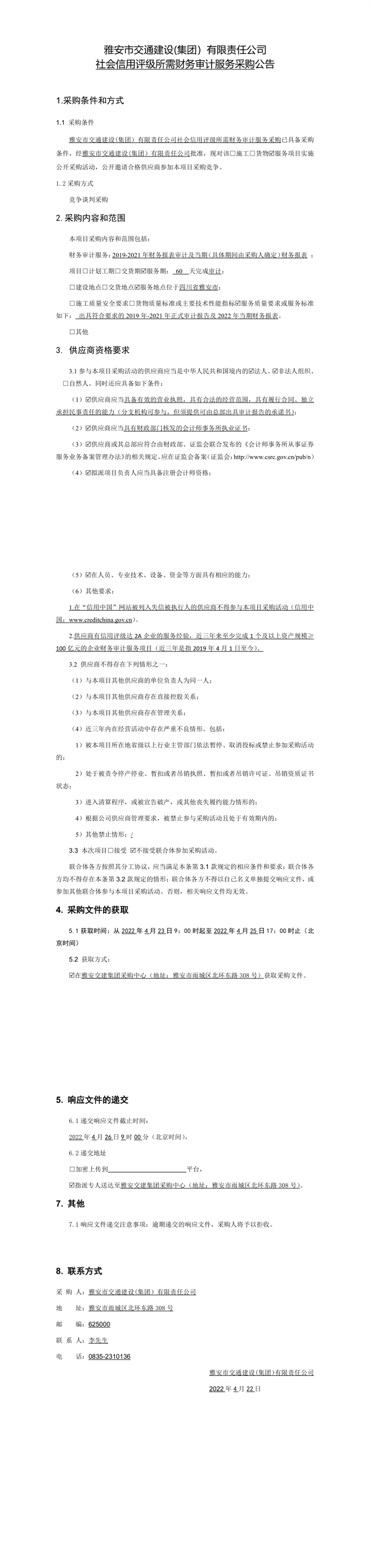 雅安市交通建設(shè)(集團)有限責任公司社會信用評級所需財務(wù)審計服務(wù)采購公告