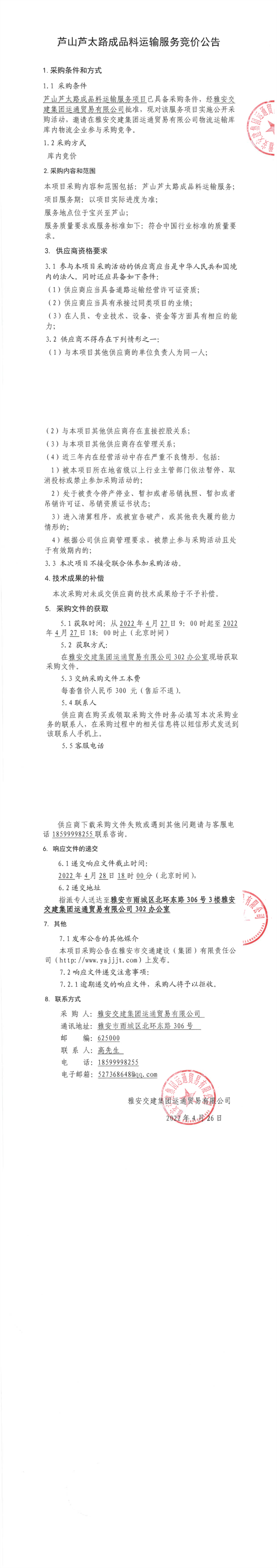 雅安交建集團(tuán)運(yùn)通貿(mào)易有限公司蘆山蘆太路成品料運(yùn)輸服務(wù)競價(jià)公告
