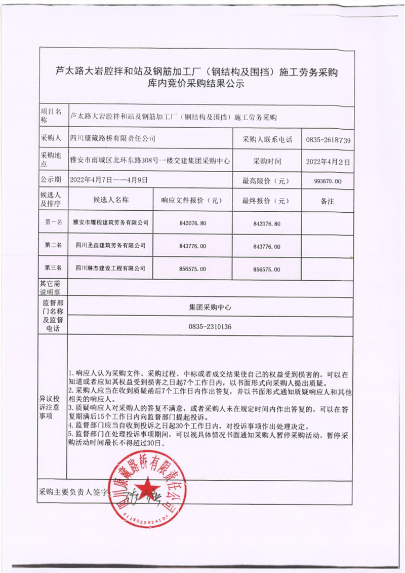 四川康藏路橋有限責(zé)任公司蘆太路大巖腔拌和站及鋼筋加工廠(鋼結(jié)構(gòu)及圍檔)施工勞務(wù)采購庫內(nèi)競價采購結(jié)果公示