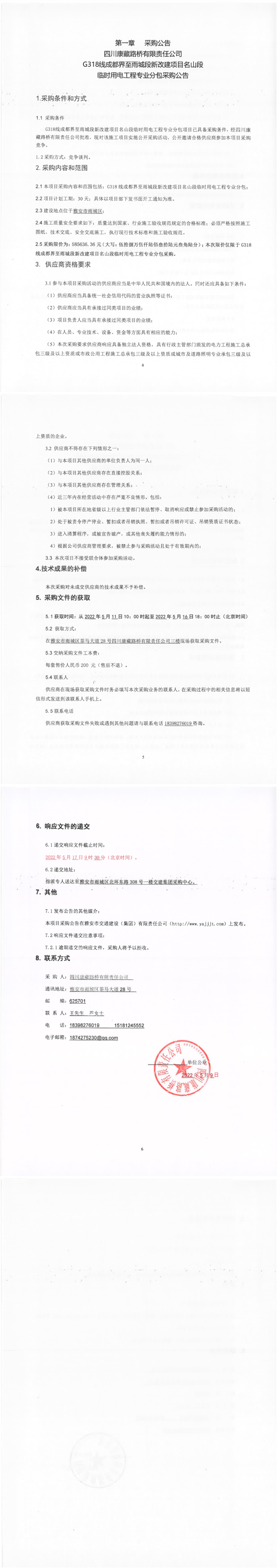 四川康藏路橋有限責(zé)任公司G318線成都界至雨城段新改建項目名山段臨時用電工程專業(yè)分包采購公告