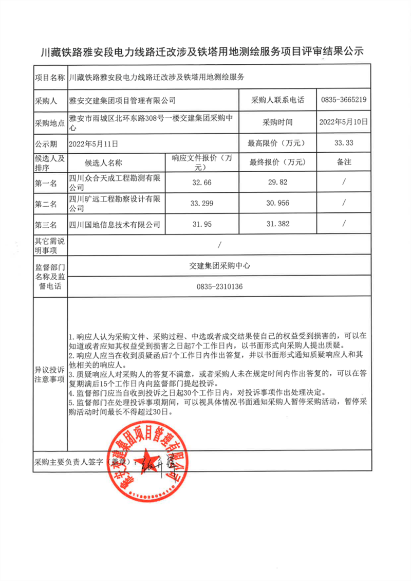 雅安交建集團項目管理有限公司川藏鐵路雅安段電力線路遷改涉及鐵塔用地測繪服務項目評審結果公示
