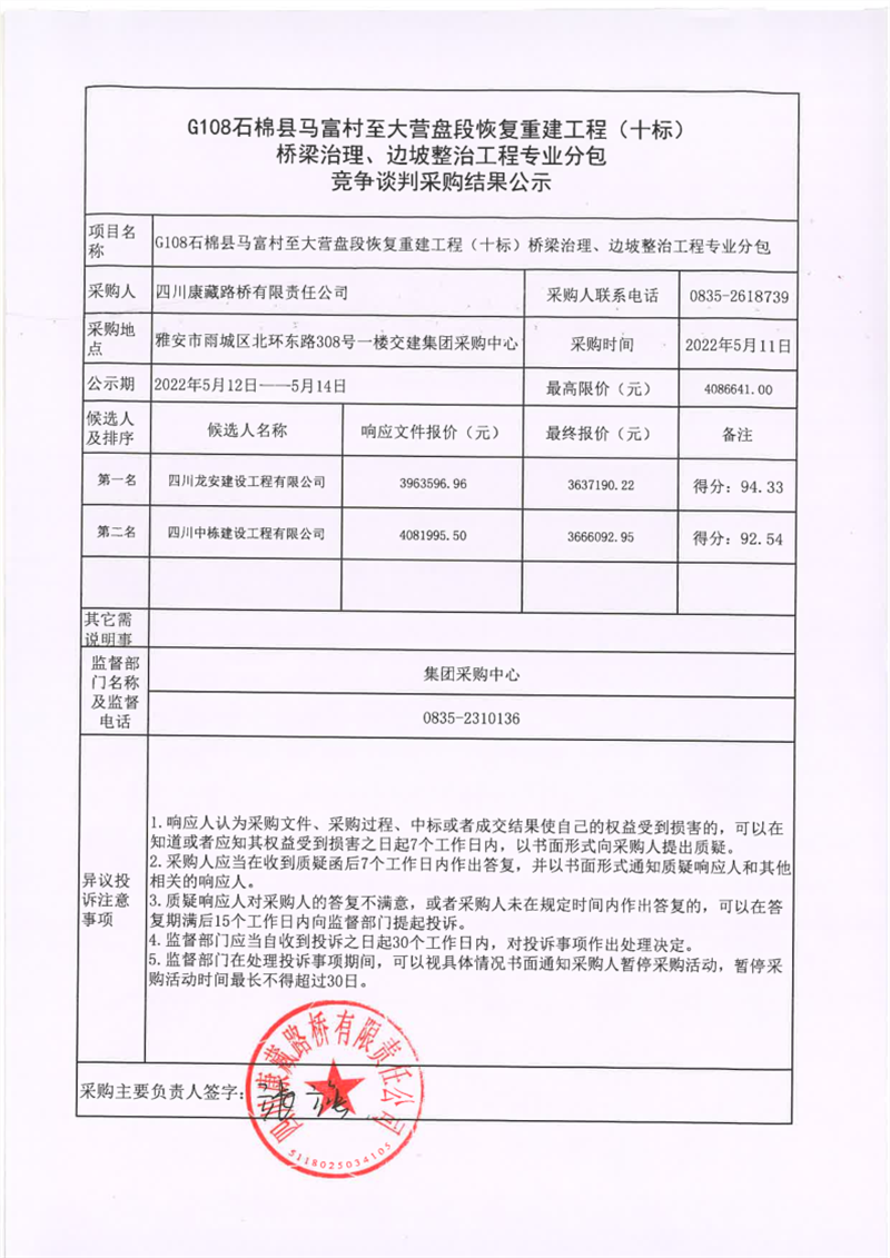 四川康藏路橋有限責(zé)任公司G108線石棉縣馬富村至大營(yíng)盤段恢復(fù)重建工程(十標(biāo))橋梁治理、邊坡整治工程專業(yè)分包競(jìng)爭(zhēng)談判采購結(jié)果公示
