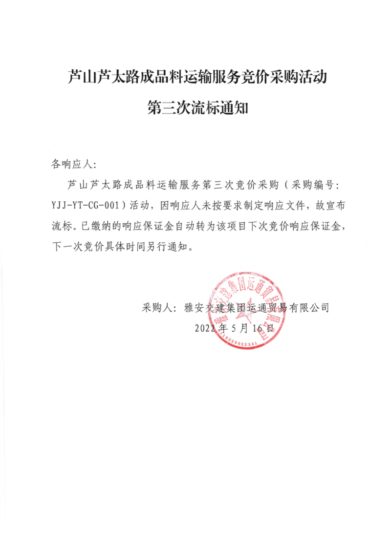 雅安交建集團(tuán)運(yùn)通貿(mào)易有限公司蘆山蘆太路成品料運(yùn)輸服務(wù)競價采購活動第三次流標(biāo)通知