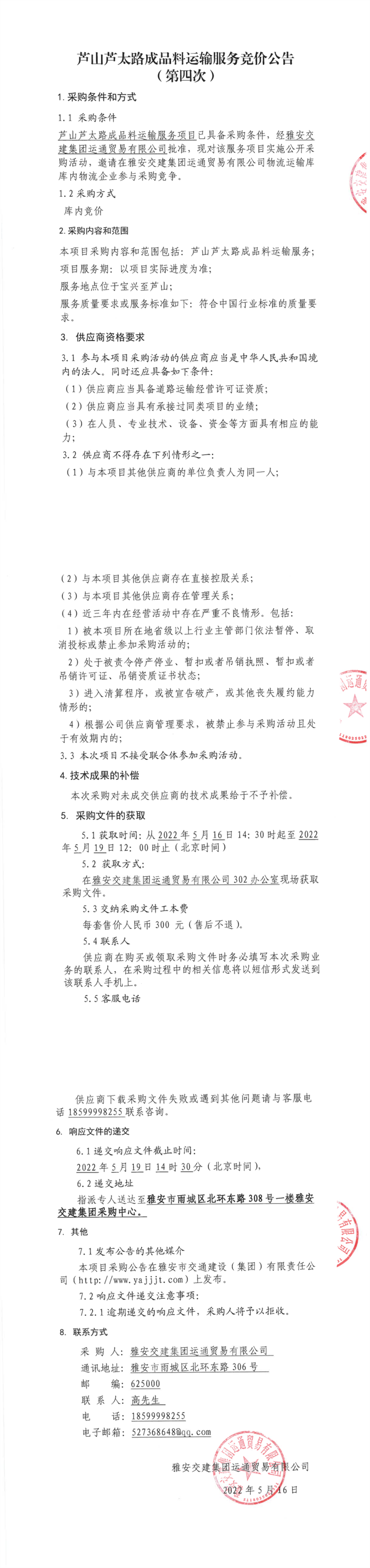 雅安交建集團(tuán)運(yùn)通貿(mào)易有限公司蘆山蘆太路成品料運(yùn)輸服務(wù)競價(jià)公告(第四次)