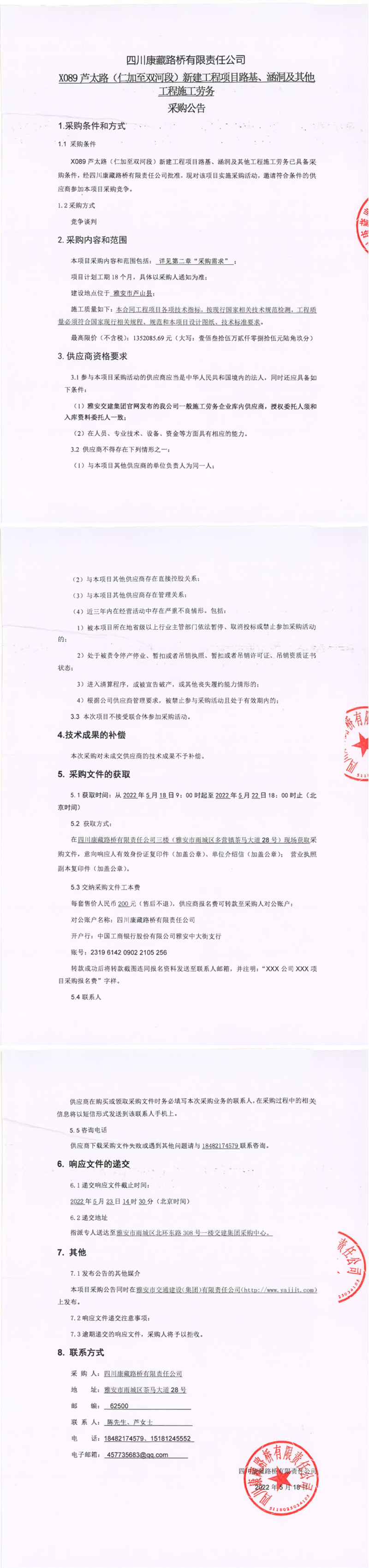 四川康藏路橋有限責(zé)任公司X089蘆太路(仁加至雙河段)新建工程項(xiàng)目路基、涵洞及其他工程施工勞務(wù)采購(gòu)公告