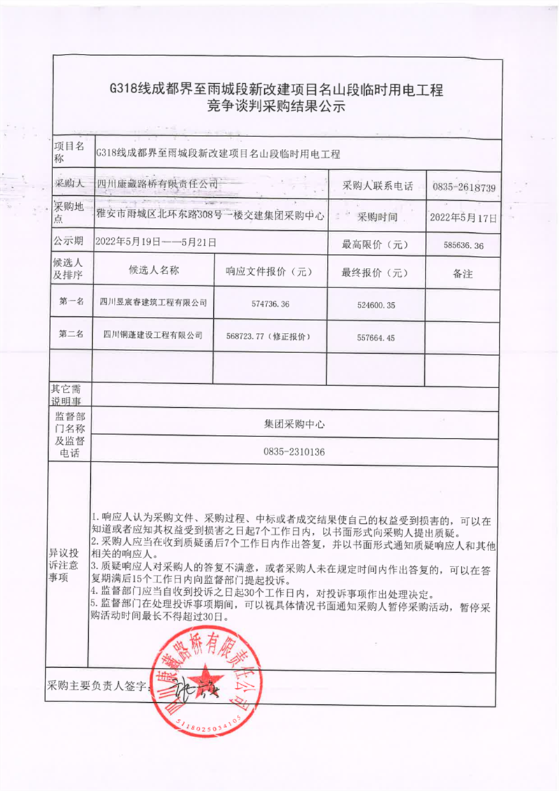 四川康藏路橋有限責(zé)任公司G318線成都界至雨城段新改建項目名山段臨時用電工程競爭談判采購結(jié)果公示