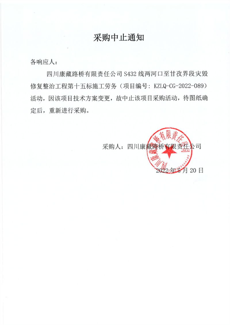 四川康藏路橋有限責任公司S432線寶興縣兩河口至甘孜界段災毀修復整治工程第十五標施工勞務采購中止通知