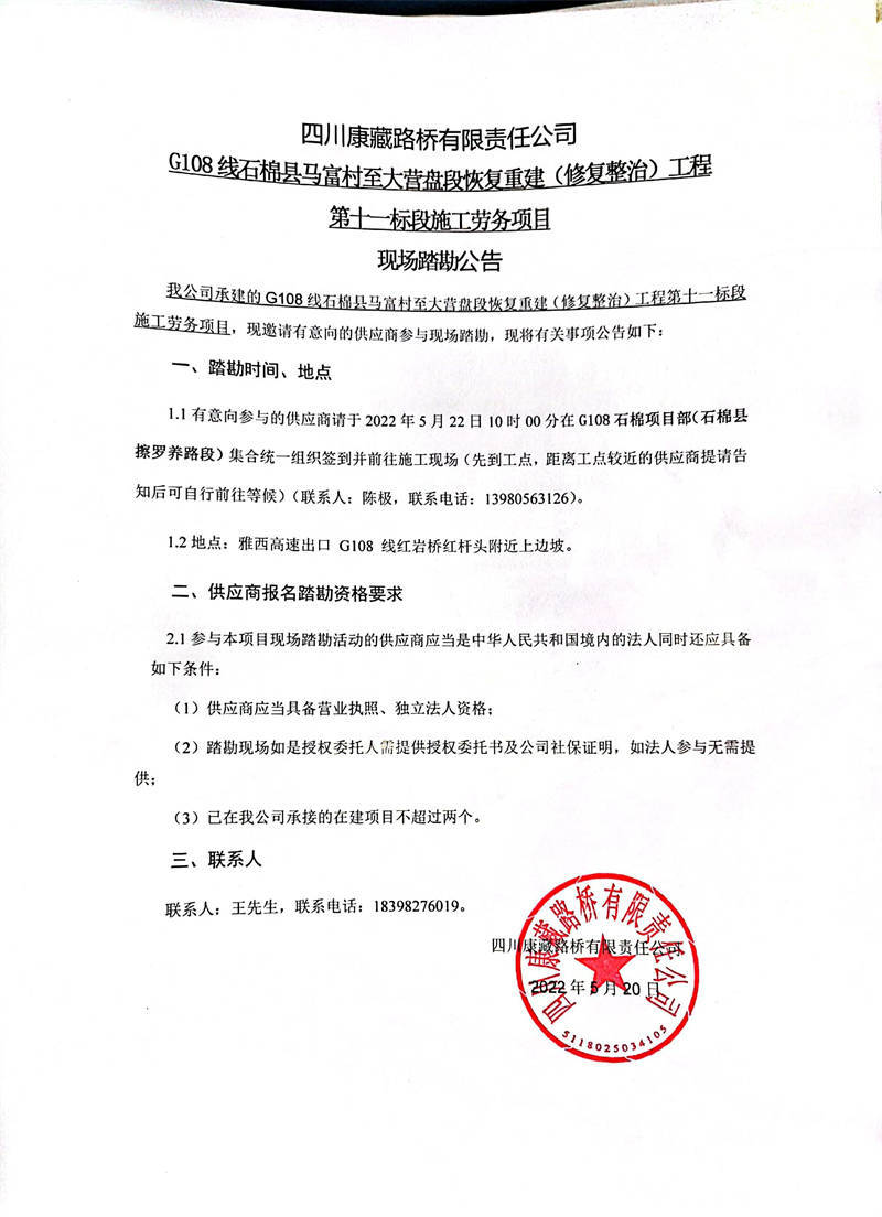四川康藏路橋有限責(zé)任公司G108線石棉縣馬福村至大營盤段恢復(fù)重建(修復(fù)整治)工程第十一標(biāo)段施工勞務(wù)項目現(xiàn)場踏勘公告
