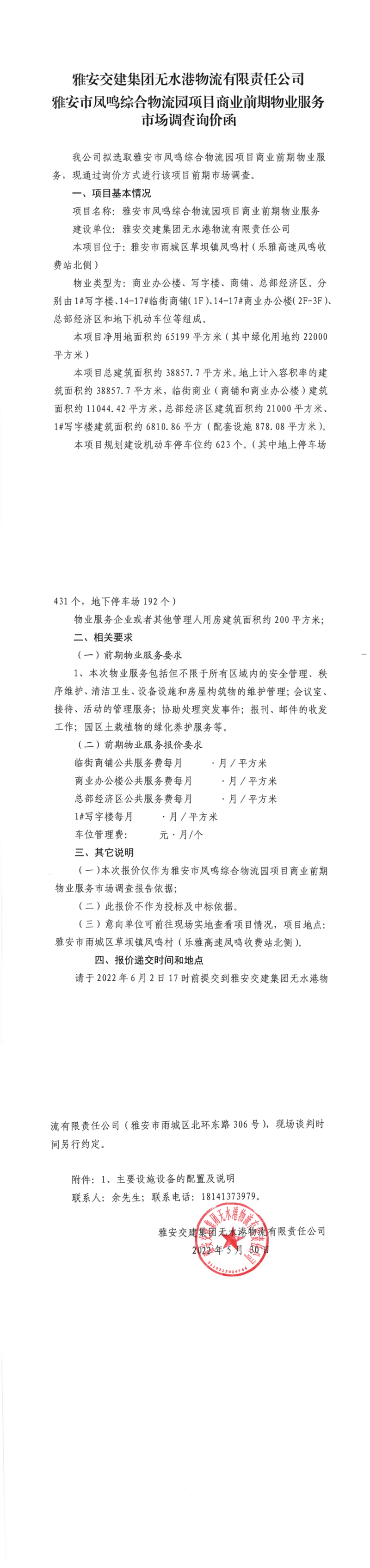 雅安交建集團無水港物流有限責任公司雅安市鳳鳴綜合物流園項目商業(yè)前期物業(yè)服務市場調(diào)查詢價函