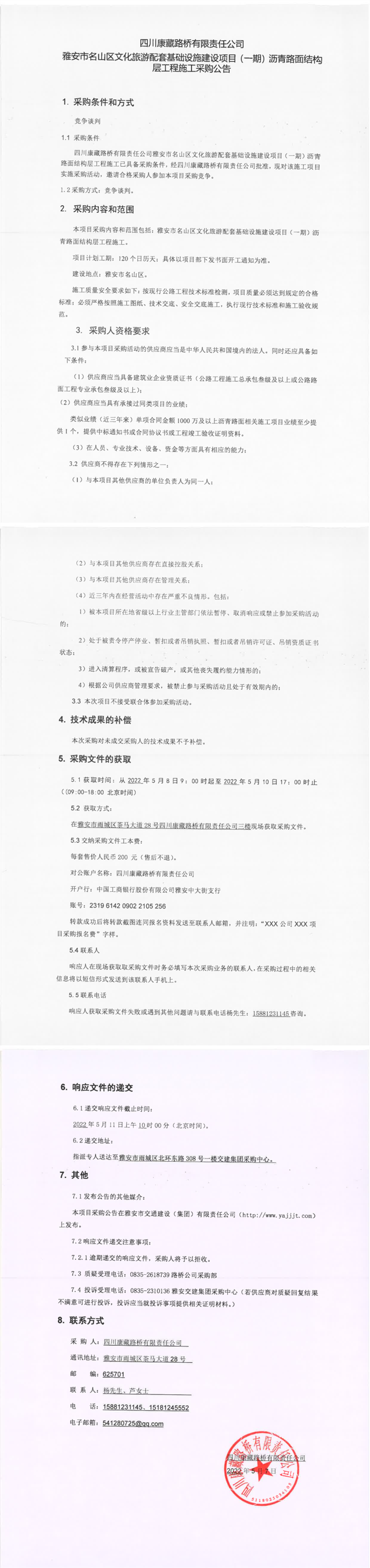 四川康藏路橋有限責(zé)任公司雅安市名山區(qū)文化旅游配套基礎(chǔ)設(shè)施建設(shè)項(xiàng)目(一期)瀝青路面結(jié)構(gòu)層工程施工采購(gòu)公告