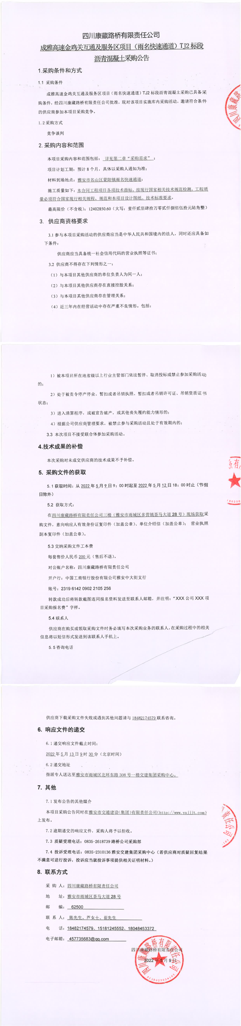 四川康藏路橋有限責(zé)任公司成雅高速金雞關(guān)互通及服務(wù)區(qū)項目(雨名快速通道)TJ2標段瀝青混凝土采購公告