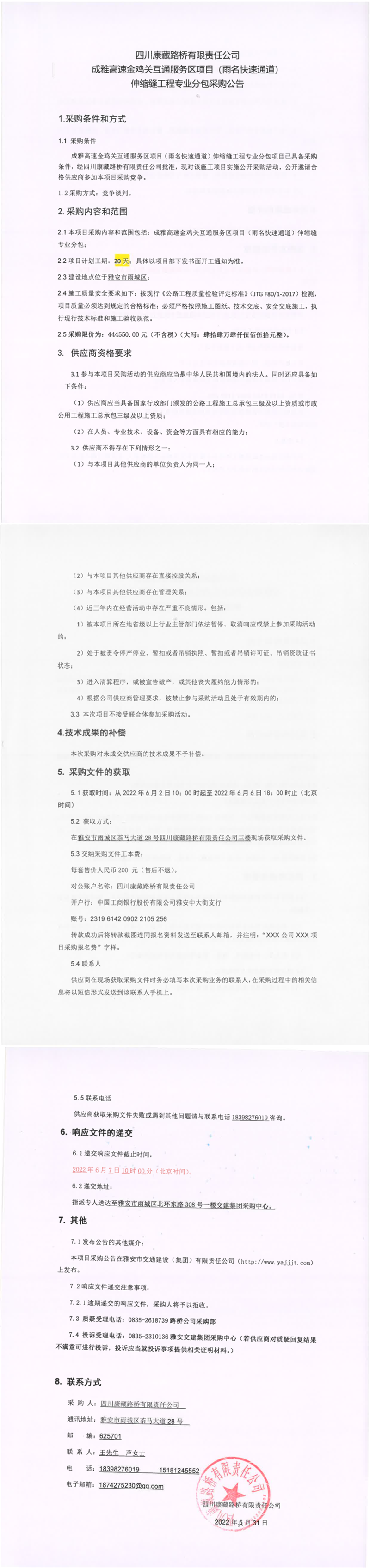 四川康藏路橋有限責(zé)任公司成雅高速金雞關(guān)互通服務(wù)區(qū)項(xiàng)目(雨名快速通道)伸縮縫工程專業(yè)分包采購公告
