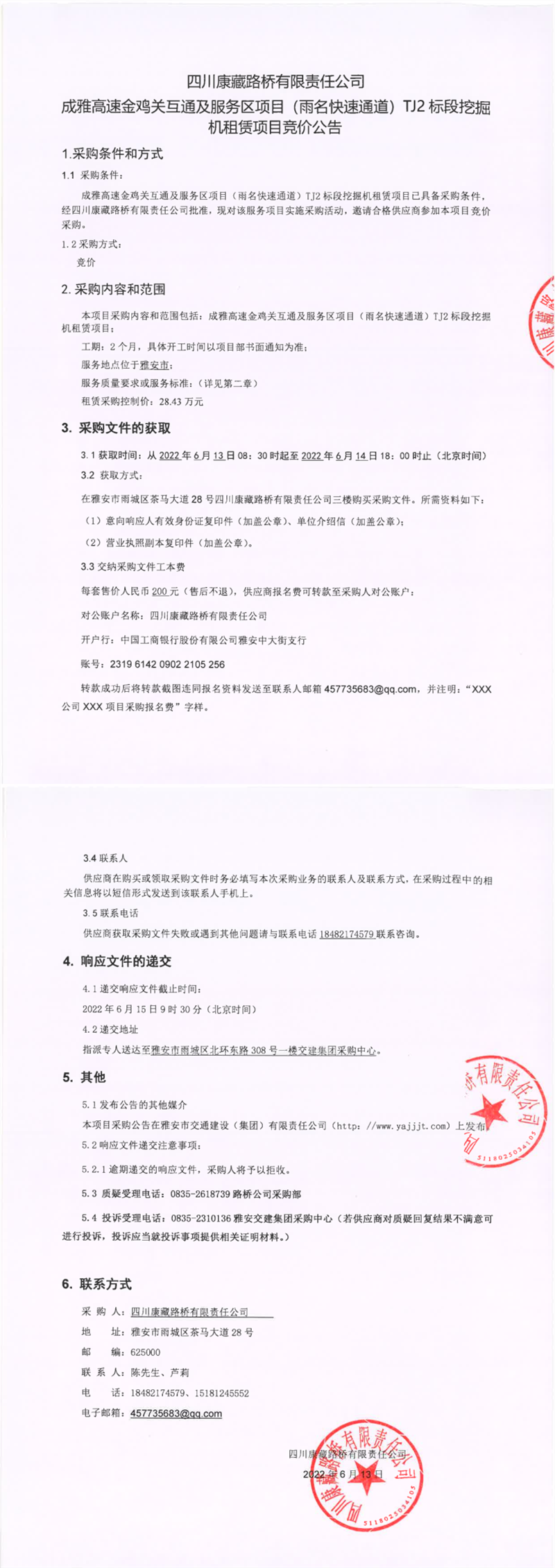 四川康藏路橋有限責(zé)任公司成雅高速金雞關(guān)互通及服務(wù)區(qū)項(xiàng)目(雨名快速通道)TJ2標(biāo)段挖掘機(jī)租賃項(xiàng)目競(jìng)價(jià)公告