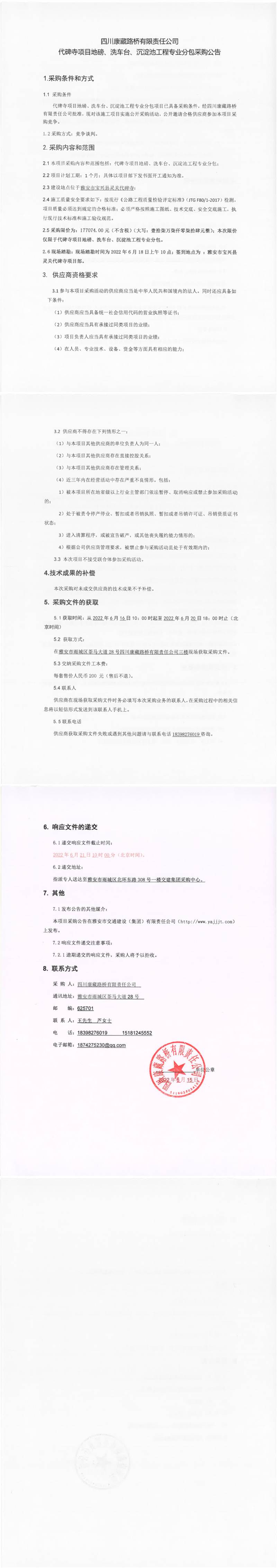四川康藏路橋有限責任公司代碑寺項目地磅、洗車臺、沉淀池工程專業(yè)分包采購公告