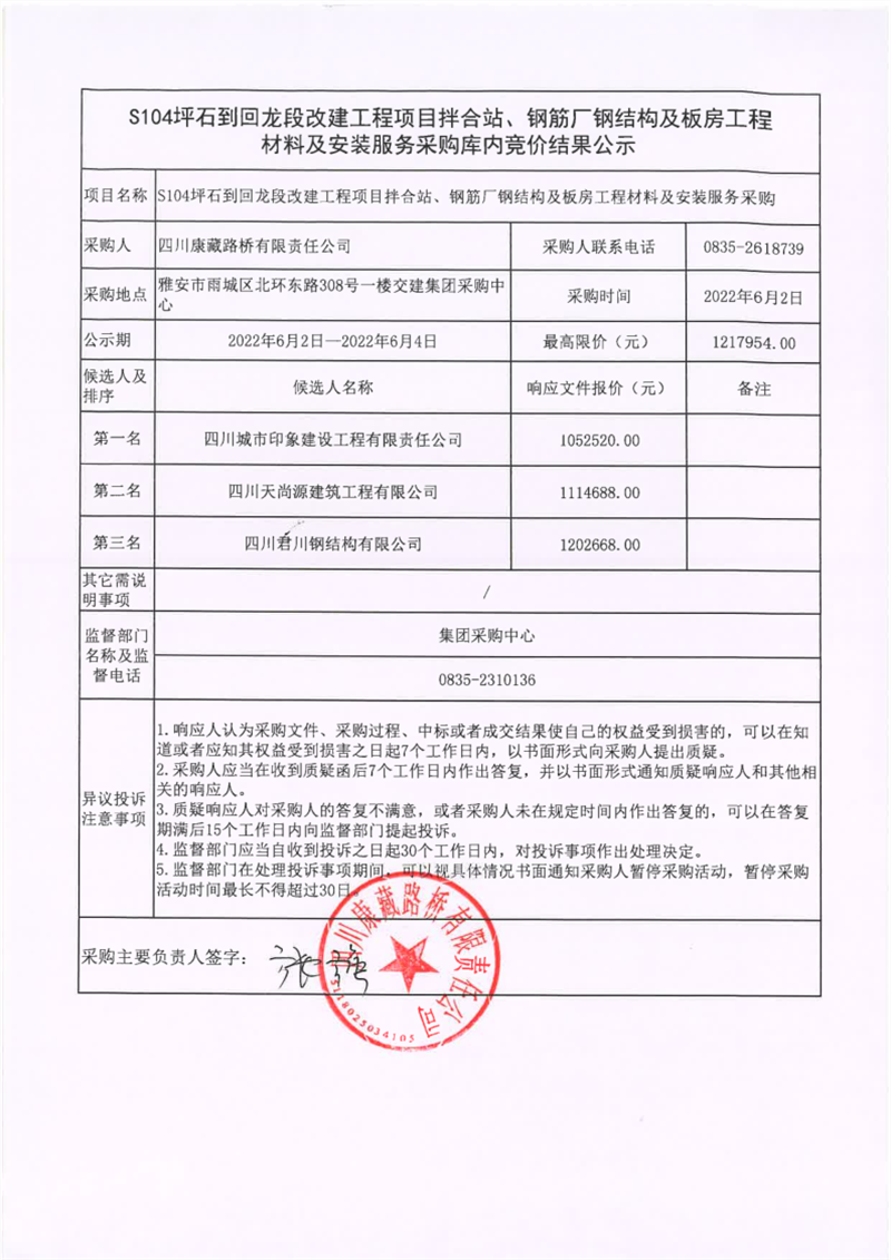 四川康藏路橋有限責任公司S104坪石到回龍段改建工程項目拌合站、鋼筋廠鋼結(jié)構(gòu)及板房工程材料及安裝服務(wù)庫內(nèi)競價結(jié)果公示