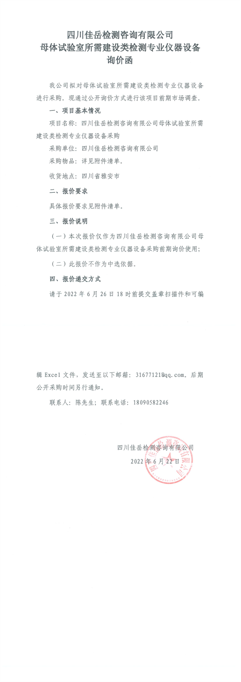 四川佳岳檢測咨詢有限公司母體試驗(yàn)室所需建設(shè)類檢測專業(yè)儀器設(shè)備詢價(jià)函
