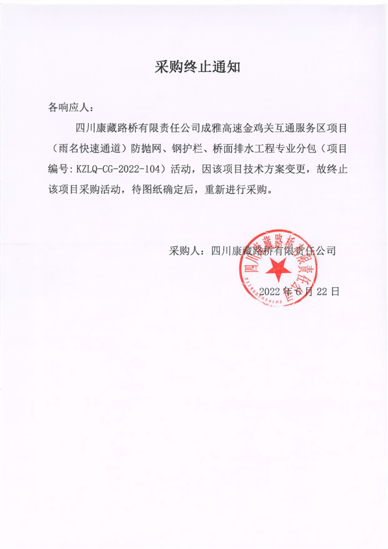 四川康藏路橋有限責(zé)任公司成雅高速金雞關(guān)互通服務(wù)區(qū)項目(雨名快速通道)防拋網(wǎng)、鋼護(hù)欄、橋面排水工程專業(yè)分包采購終止通知