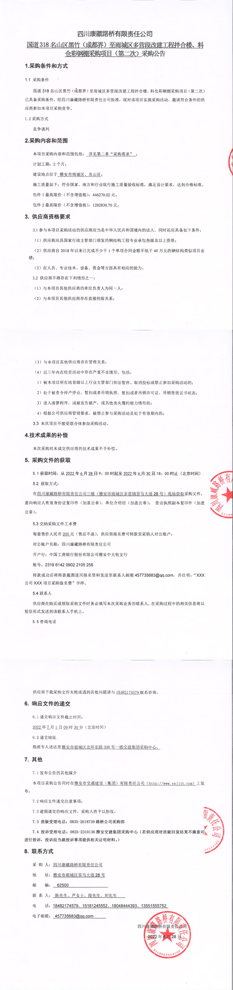 四川康藏路橋有限責(zé)任公司國(guó)道318名山區(qū)黑竹(成都界)至雨城區(qū)多營(yíng)段改建工程拌合樓、料倉(cāng)彩鋼棚采購(gòu)項(xiàng)目(第二次)采購(gòu)公告