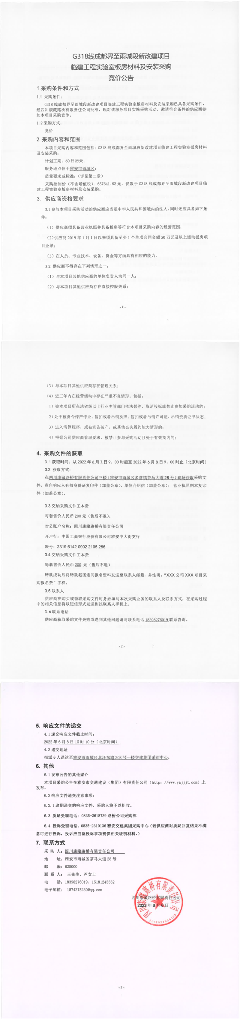 四川康藏路橋有限責任公司G318線成都界至雨城段新改建項目臨建工程實驗室板房材料及安裝采購競價公告