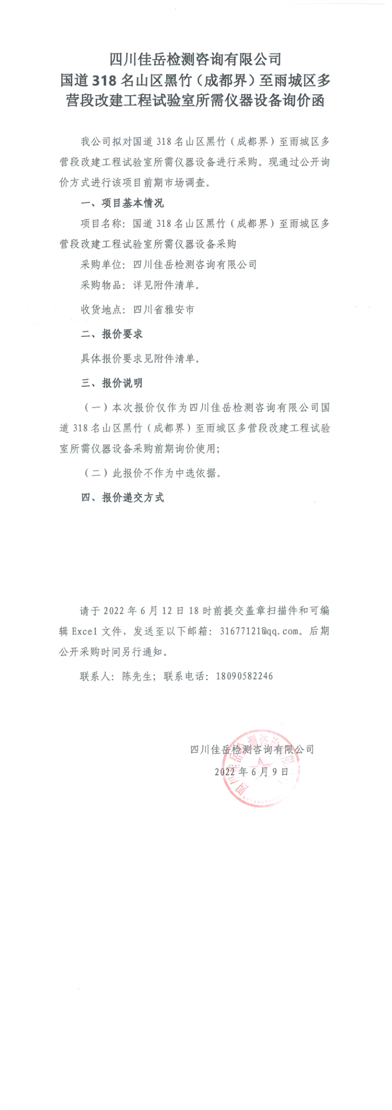 四川佳岳檢測(cè)咨詢有限公司國(guó)道318名山區(qū)黑竹(成都界)至雨城區(qū)多營(yíng)段改建工程試驗(yàn)室所需儀器設(shè)備詢價(jià)函