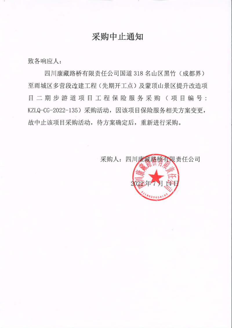 四川康藏路橋有限責(zé)任公司國(guó)道318名山區(qū)黑竹(成都界)至雨城區(qū)多營(yíng)段改建工程(先期開(kāi)工點(diǎn))及蒙頂山景區(qū)提升改造項(xiàng)目二期步游道項(xiàng)目工程保險(xiǎn)服務(wù)采購(gòu)中止通知
