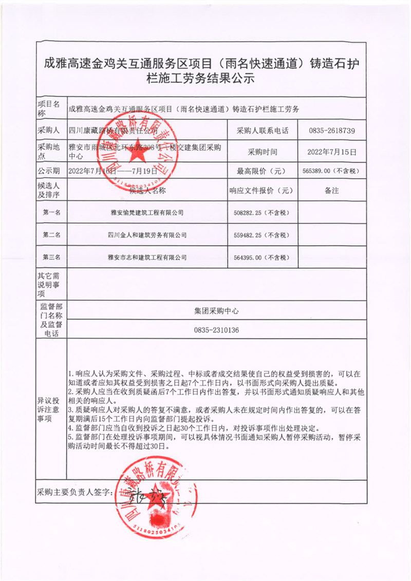 四川康藏路橋有限責任公司成雅高速金雞關互通服務區(qū)項目(雨名快速通道)鑄造石護欄工程施工勞務結果公示