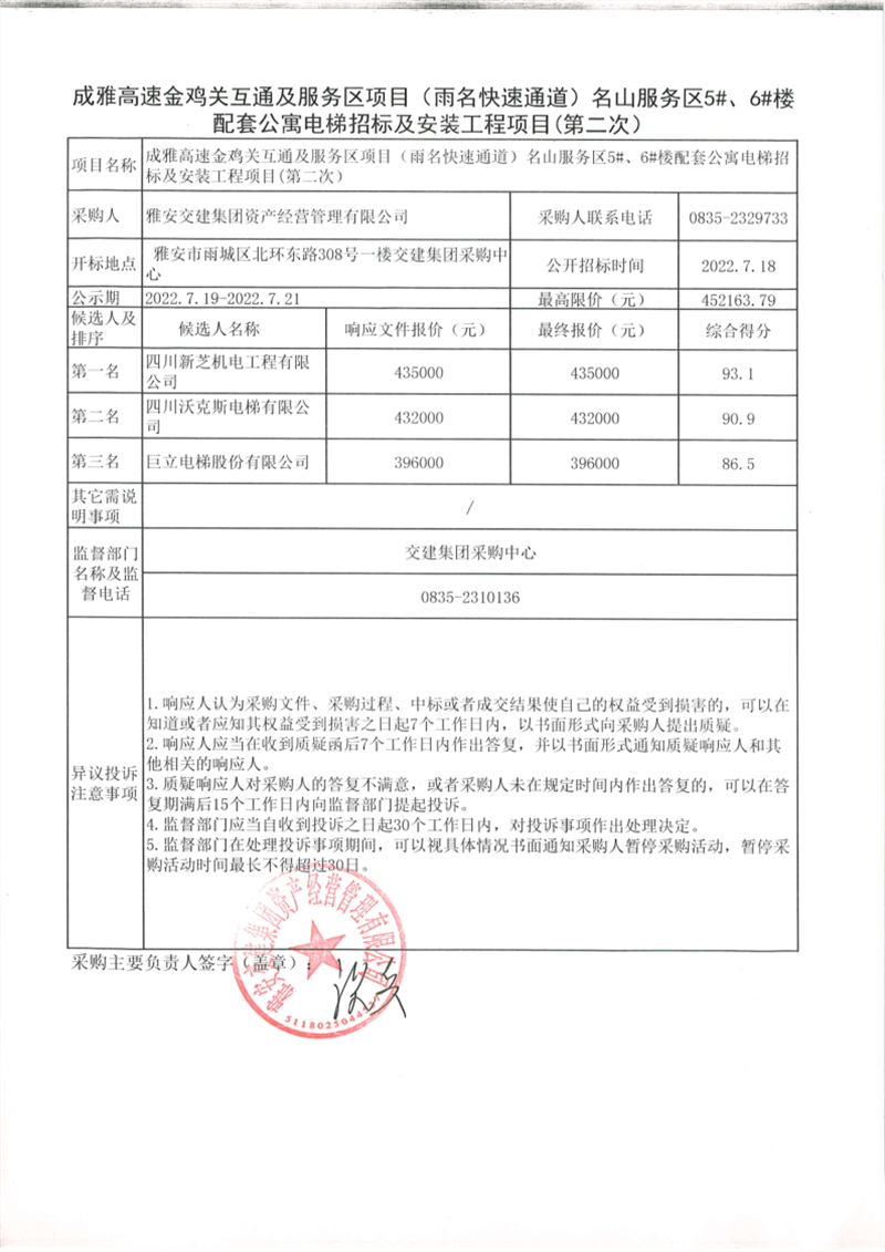雅安交建集團(tuán)資產(chǎn)經(jīng)營管理有限公司成雅高速金雞關(guān)互通及服務(wù)區(qū)項目(雨名快速通道)名山服務(wù)區(qū)5#、6#樓配套公寓電梯招標(biāo)及安裝工程項目招標(biāo)公告(第二次)結(jié)果公示