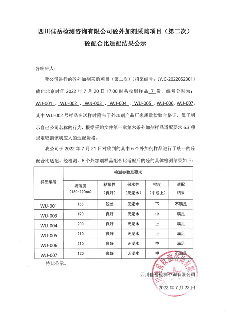 四川佳岳檢測(cè)咨詢(xún)有限公司砼外加劑采購(gòu)項(xiàng)目(第二次)砼配合比適配結(jié)果公示