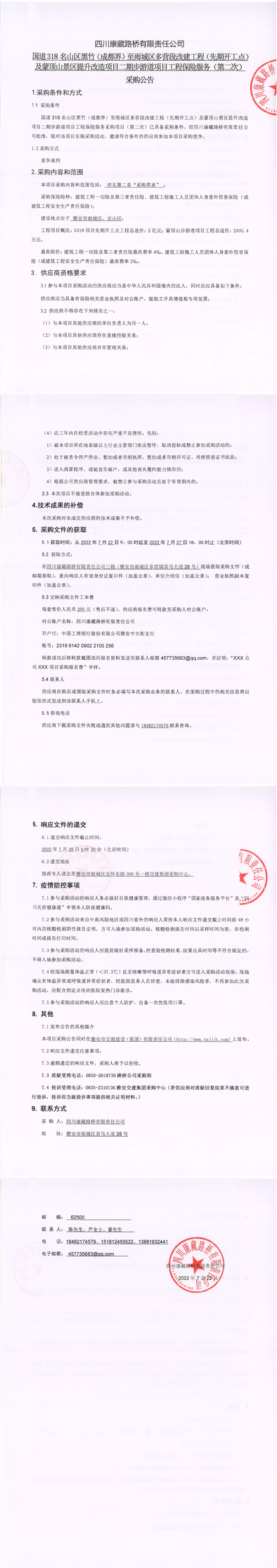 四川康藏路橋有限責(zé)任公司國道318名山區(qū)黑竹(成都界)至雨城區(qū)多營段改建工程(先期開工點)及蒙頂山景區(qū)提升改造項目二期步游道項目工程保險服務(wù)(第二次)采購公告