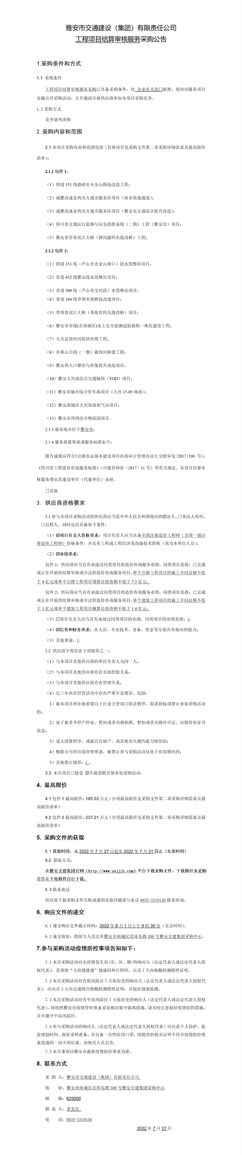 雅安市交通建設(shè)(集團(tuán))有限責(zé)任公司工程項(xiàng)目結(jié)算審核服務(wù)采購(gòu)公告
