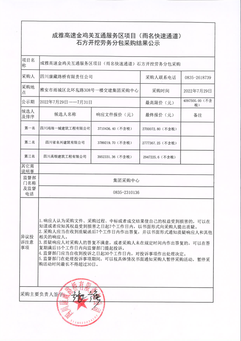 四川康藏路橋有限責(zé)任公司成雅高速金雞關(guān)互通服務(wù)區(qū)項目(雨名快速通道)石方開挖勞務(wù)分包采購結(jié)果公示