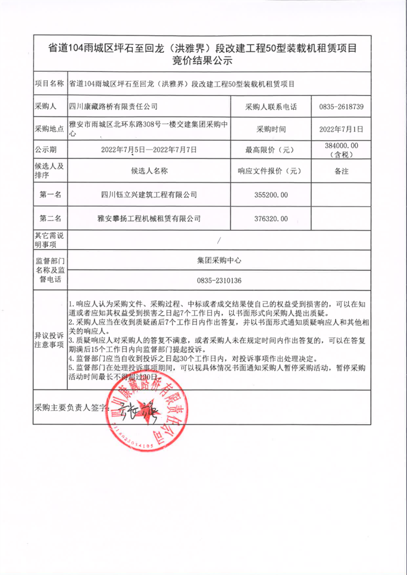 四川康藏路橋有限責(zé)任公司省道104雨城區(qū)坪石至回龍(洪雅界)段改建工程50型裝載機(jī)租賃項目競價結(jié)果公示