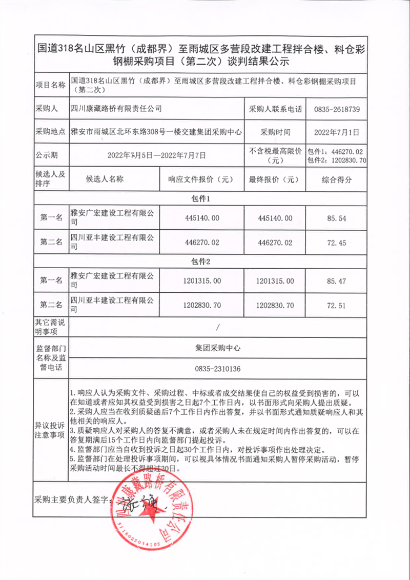 四川康藏路橋有限責任公司國道318名山區(qū)黑竹(成都界)至雨城區(qū)多營段改建工程拌合樓、料倉彩鋼棚采購項目(第二次)談判結(jié)果公示