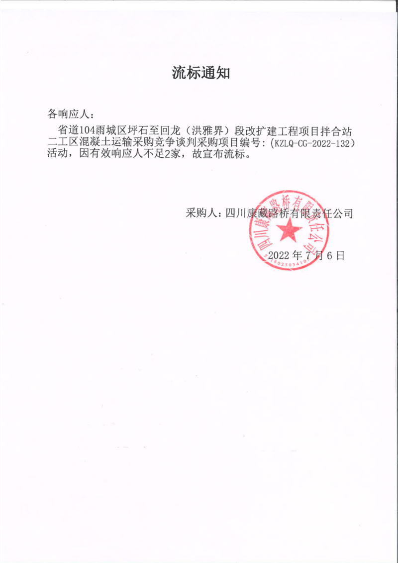 四川康藏路橋有限責(zé)任公司省道104線雨城區(qū)坪石至回龍(洪雅界)段改建工程項目拌合站二工區(qū)混凝土運(yùn)輸采購競爭談判采購項目流標(biāo)通知