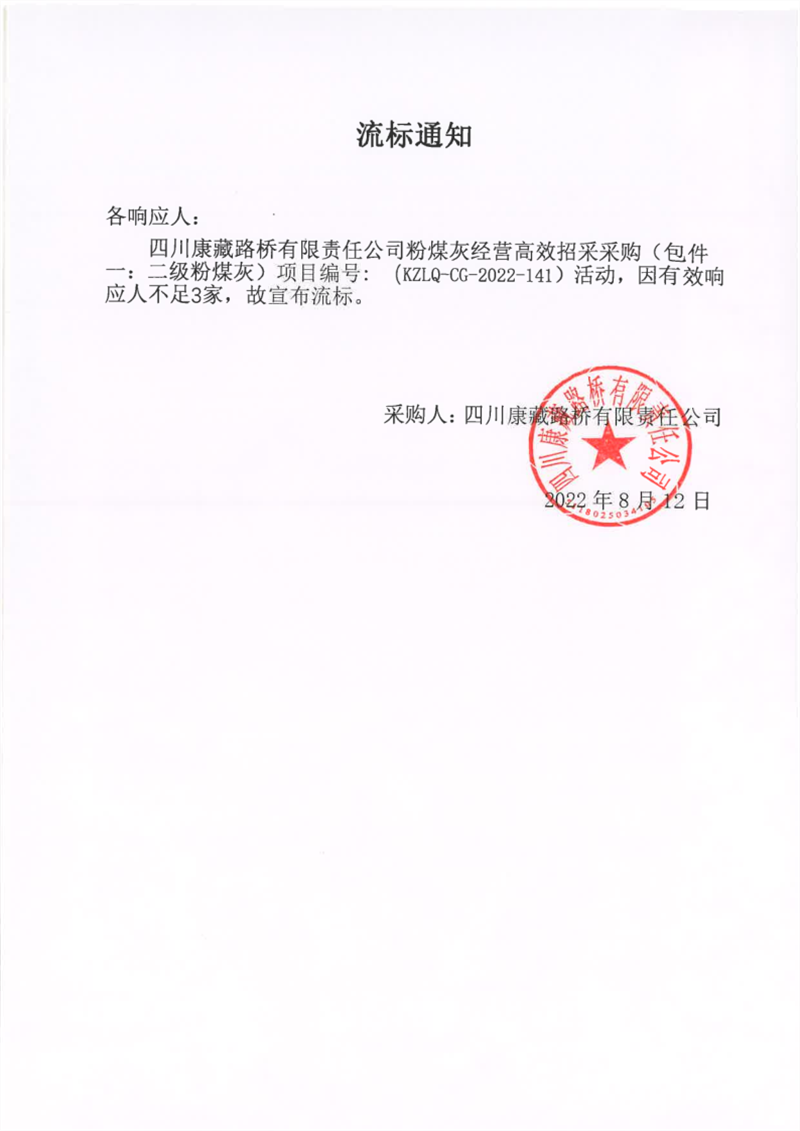 四川康藏路橋有限責(zé)任公司粉煤灰經(jīng)營(yíng)高效招采采購(gòu)(包件一:二級(jí)粉煤灰)流標(biāo)通知