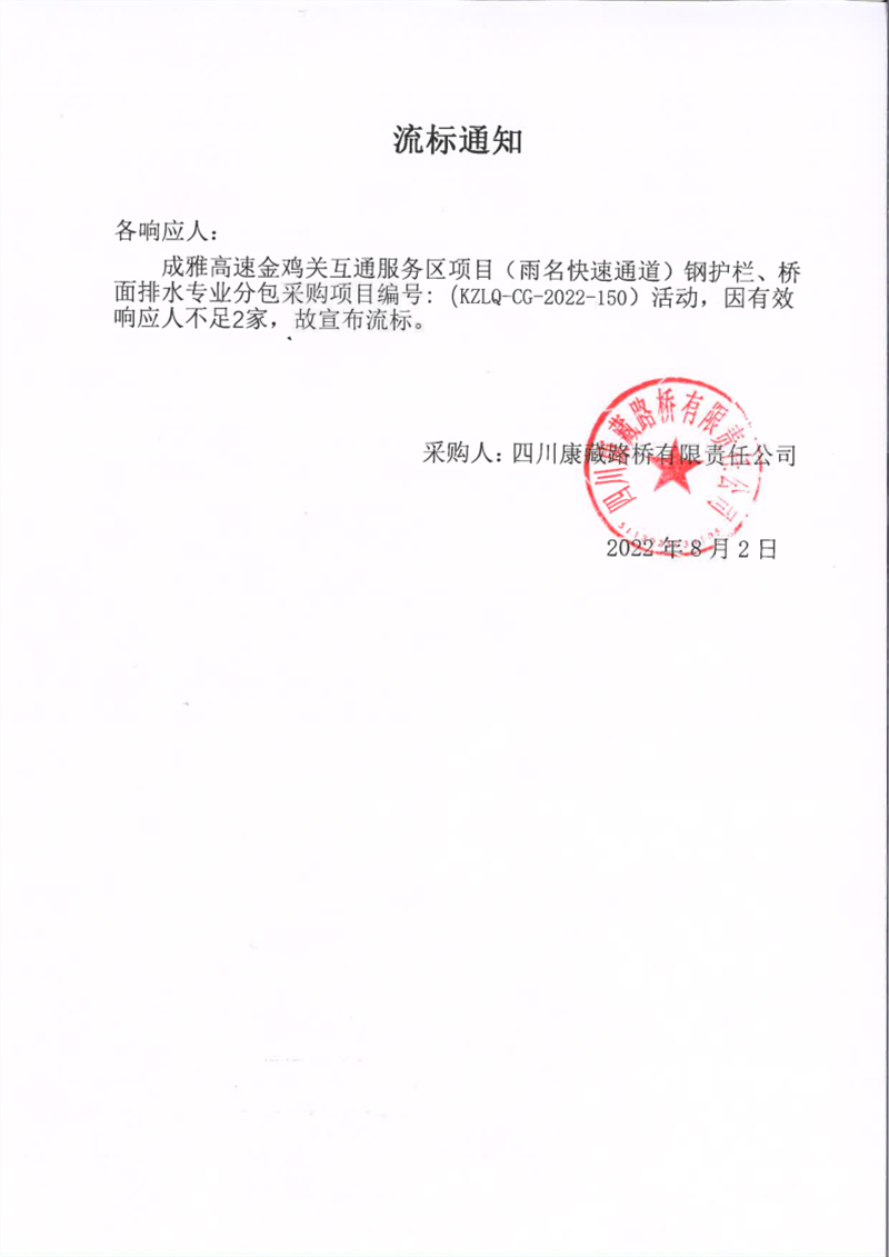 四川康藏路橋有限責(zé)任公司成雅高速金雞關(guān)互通服務(wù)區(qū)項(xiàng)目(雨名快速通道)鋼護(hù)欄、橋面排水專(zhuān)業(yè)分包采購(gòu)項(xiàng)目流標(biāo)通知