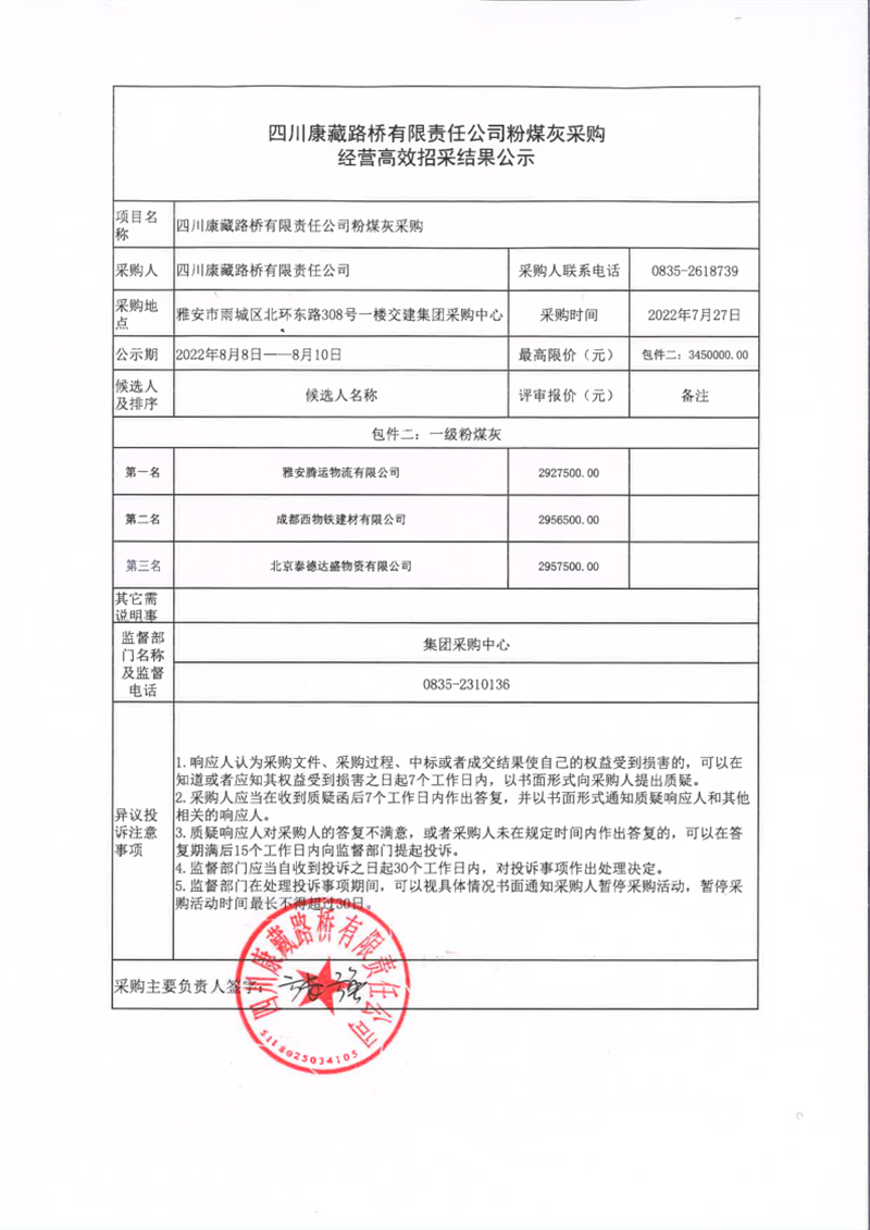 四川康藏路橋有限責(zé)任公司粉煤灰采購(gòu)經(jīng)營(yíng)高效招采結(jié)果公示