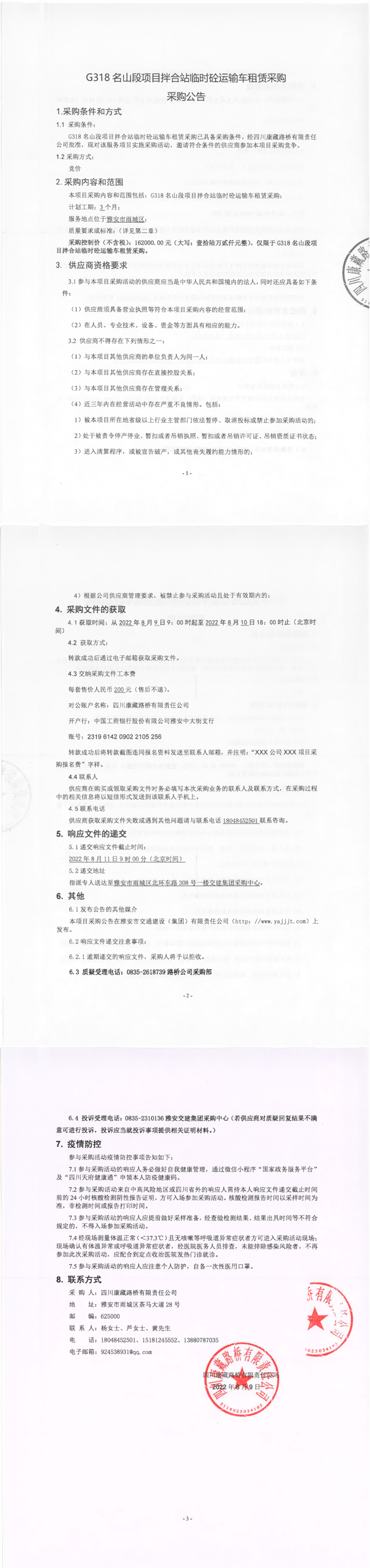 四川康藏路橋有限責任公司G318名山段項目拌合站臨時砼運輸車租賃采購采購公告
