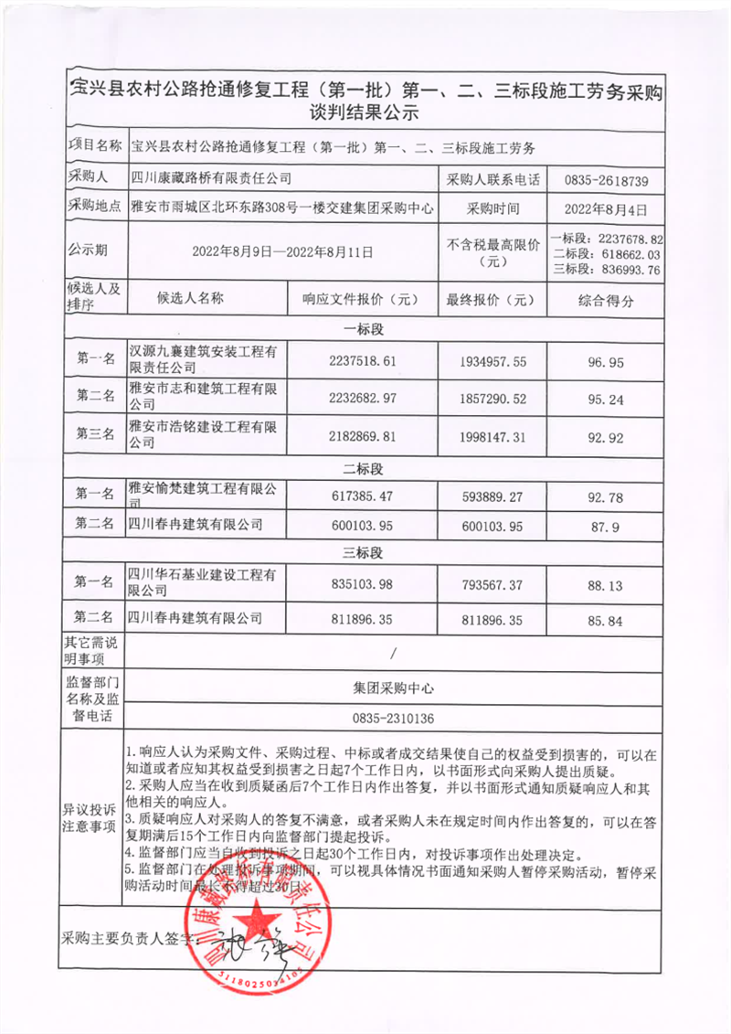 四川康藏路橋有限責任公司寶興縣農材公路搶通修復工程(第一批)第一、二、三標段施工勞務談判結果公示