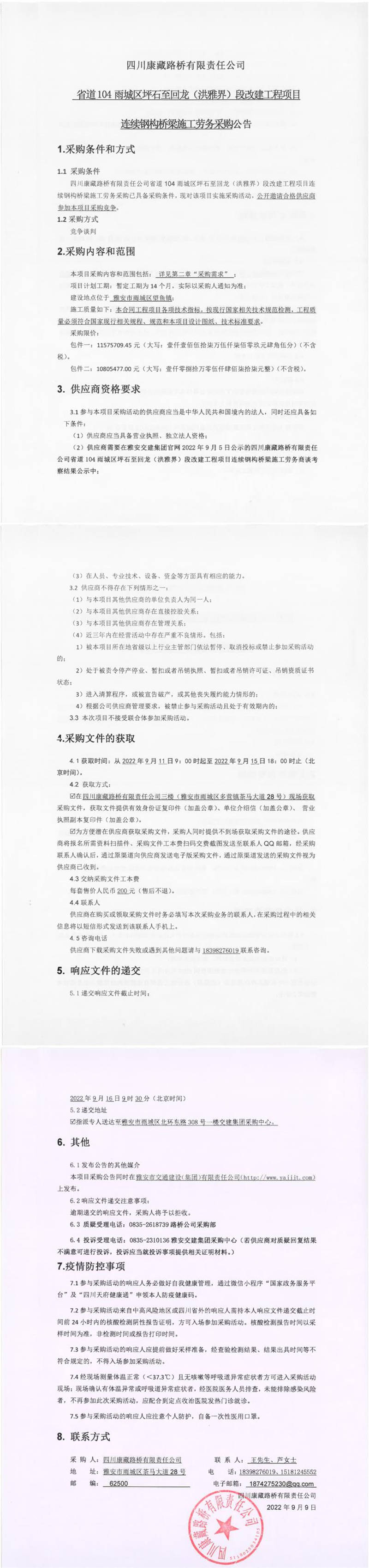 四川康藏路橋有限責任公司省道104雨城區(qū)坪石至回龍(洪雅界)段改建工程項目連續(xù)鋼構橋梁施工勞務采購公告