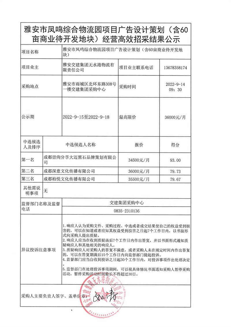 雅安交建集團無水港物流有限責任公司雅安市鳳鳴綜合物流園項目廣告設計策劃(含60畝商業(yè)待開發(fā)地塊)經(jīng)營高效招采結果公示