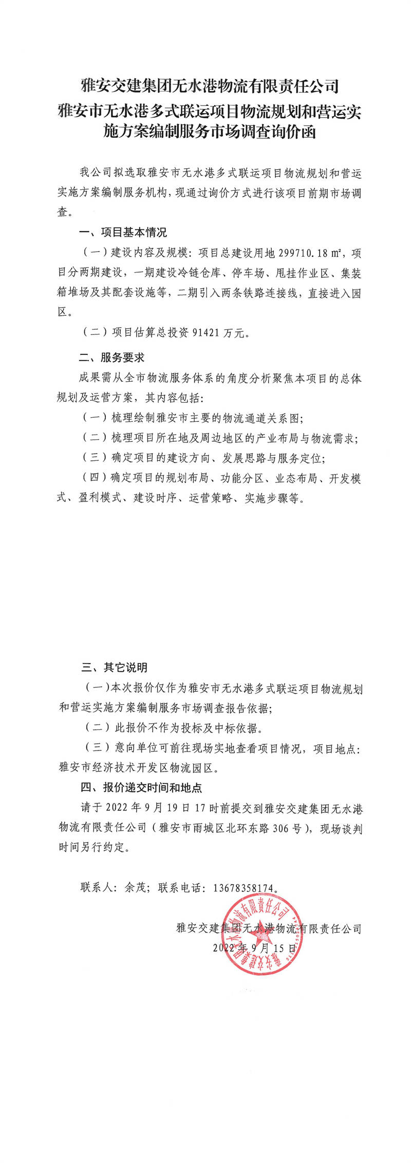 雅安交建集團無水港物流有限責任公司雅安市無水港多式聯(lián)運項目物流規(guī)劃和營運實施方案編制服務市場調(diào)查詢價函