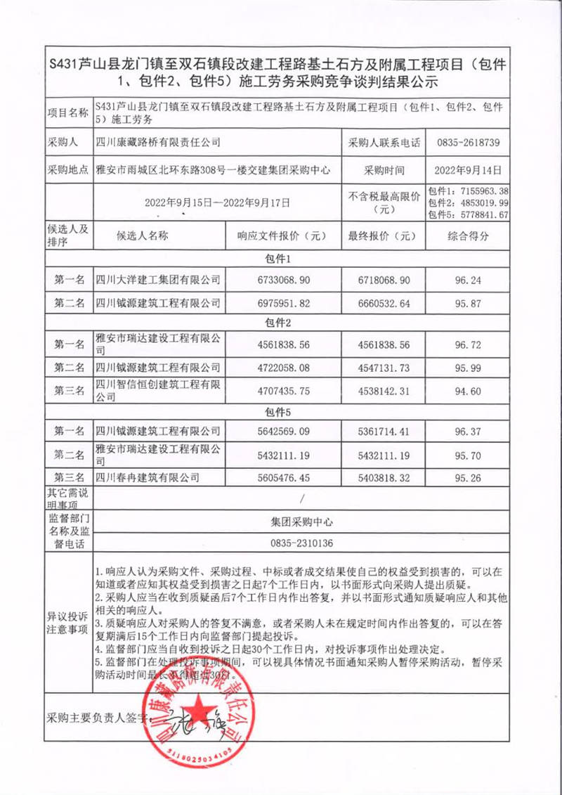 四川康藏路橋有限責任公司S431蘆山縣龍門鎮(zhèn)至雙石鎮(zhèn)段改建工程路基土石方及附屬工程項目(包件1、包件2、包件5)施工勞務(wù)采購競爭談判結(jié)果公示
