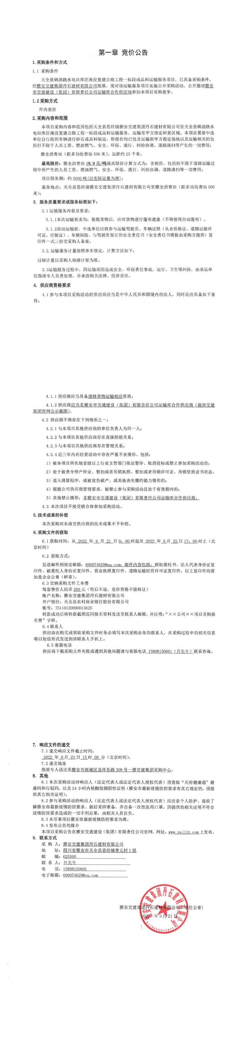 雅安交建集團(tuán)丹石建材有限公司天全縣鍋浪蹺水電站庫(kù)區(qū)淹沒復(fù)建公路工程一標(biāo)段成品料運(yùn)輸服務(wù)項(xiàng)目競(jìng)價(jià)公告