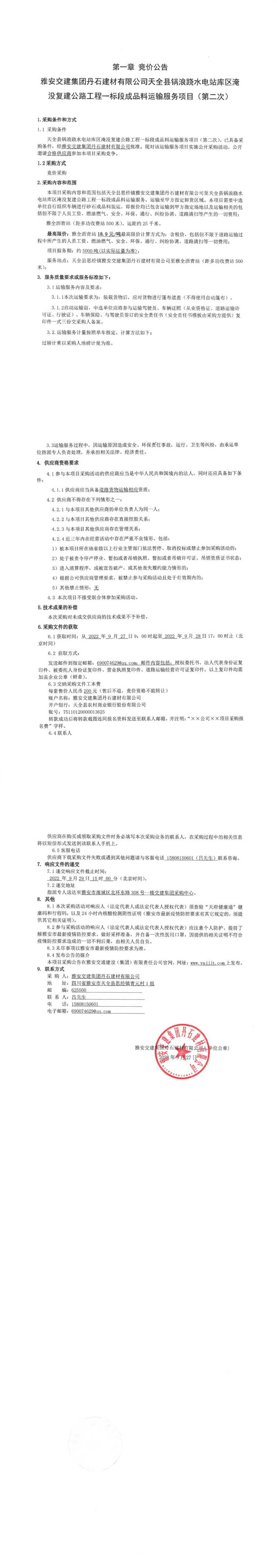 雅安交建集團丹石建材有限公司天全縣鍋浪蹺水電站庫區(qū)淹沒復建公路工程一標段成品料運輸服務項目(第二次)競價公告