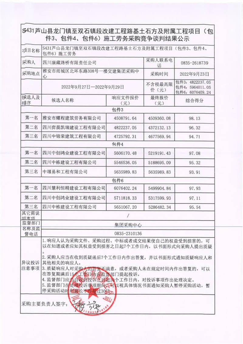四川康藏路橋有限責(zé)任公司S431蘆山縣龍門(mén)鎮(zhèn)至雙石鎮(zhèn)段改建工程路基土石方及附屬工程項(xiàng)目(包件3、包件4、包件6)施工勞務(wù)采購(gòu)競(jìng)爭(zhēng)談判結(jié)果公示